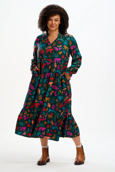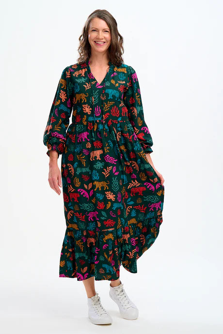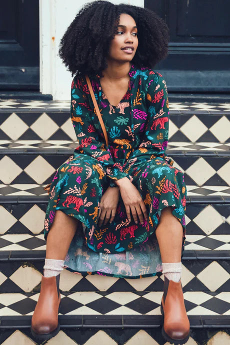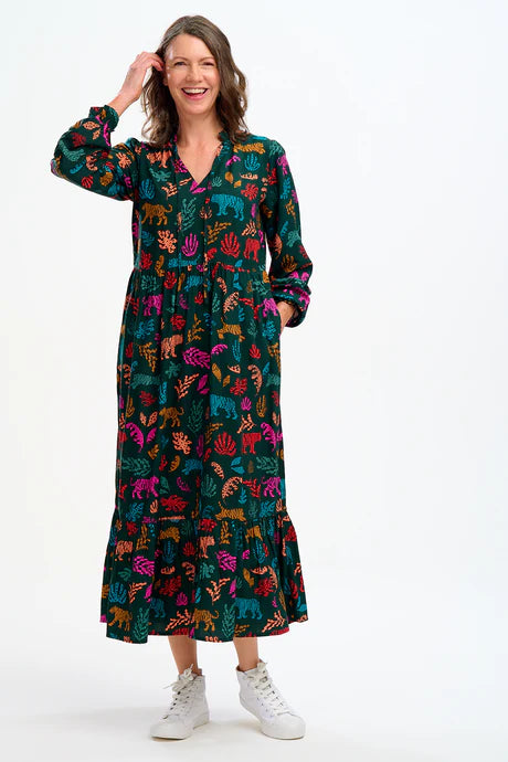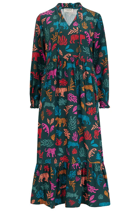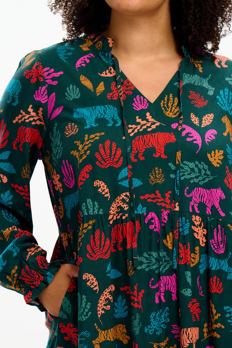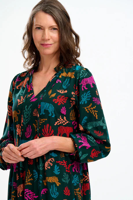 A dress to wear over and over, Annalise is our new everyday favourite. Its new boxy shape features an V neck with skinny ties, full length sleeves and a full smock skirt with a deep frill hem and pockets. A standout print in the Autumn collection, the hand-illustrated Tiger Cutouts print features a stylised animal and plant print in deep jewel tones on a dark green base.